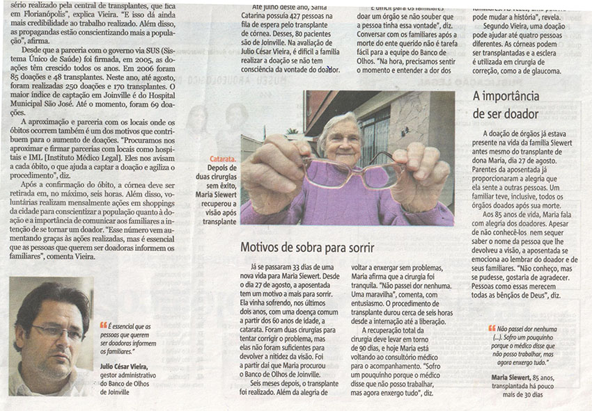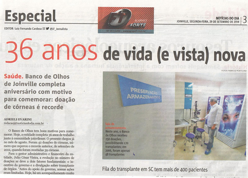 O Banco de Olhos de Joinville é constantemente destaque na imprensa regional e estadual por seu trabalho de excelência em oftalmologia e captação de córneas. Nesta área, você confere reportagens, entrevistas e matérias publicadas em diversos veículos de comunicação que reconhecem nossa atuação e compromisso com a saúde ocular em Santa Catarina.