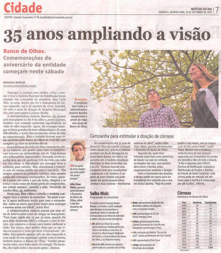 Comemoração do aniversário da entidade. Campanha para estimular a doação de córneas.